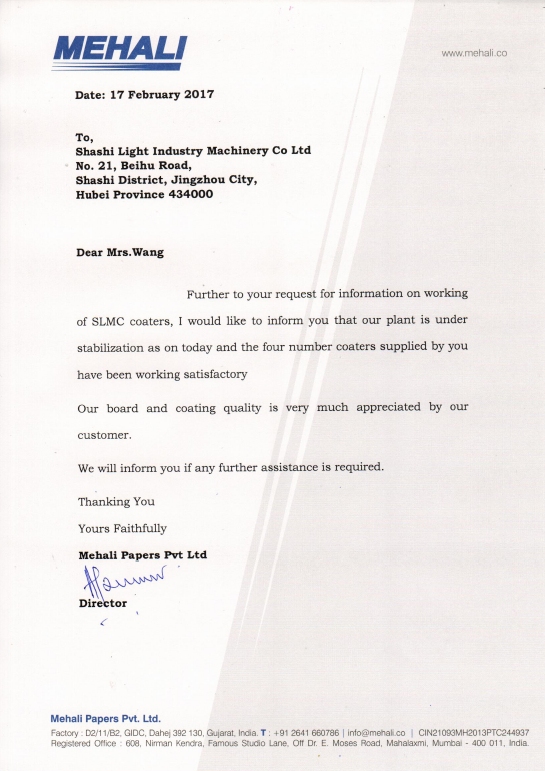We received a email from India Mehali Papers Pvt. Ltd. on Feb. 17, 2017. In this email, Mehali gives the high evaluation to SLMC’s 4 sets of coating equipment with stable operation and good coating quality. The productions is very much appreciated by their customer. The highest praise for our quality and work is the best drive for us. SLMC will continue to implement the quality and brand strategy, and strive to provide more quality products and services to domestic and foreign customers.